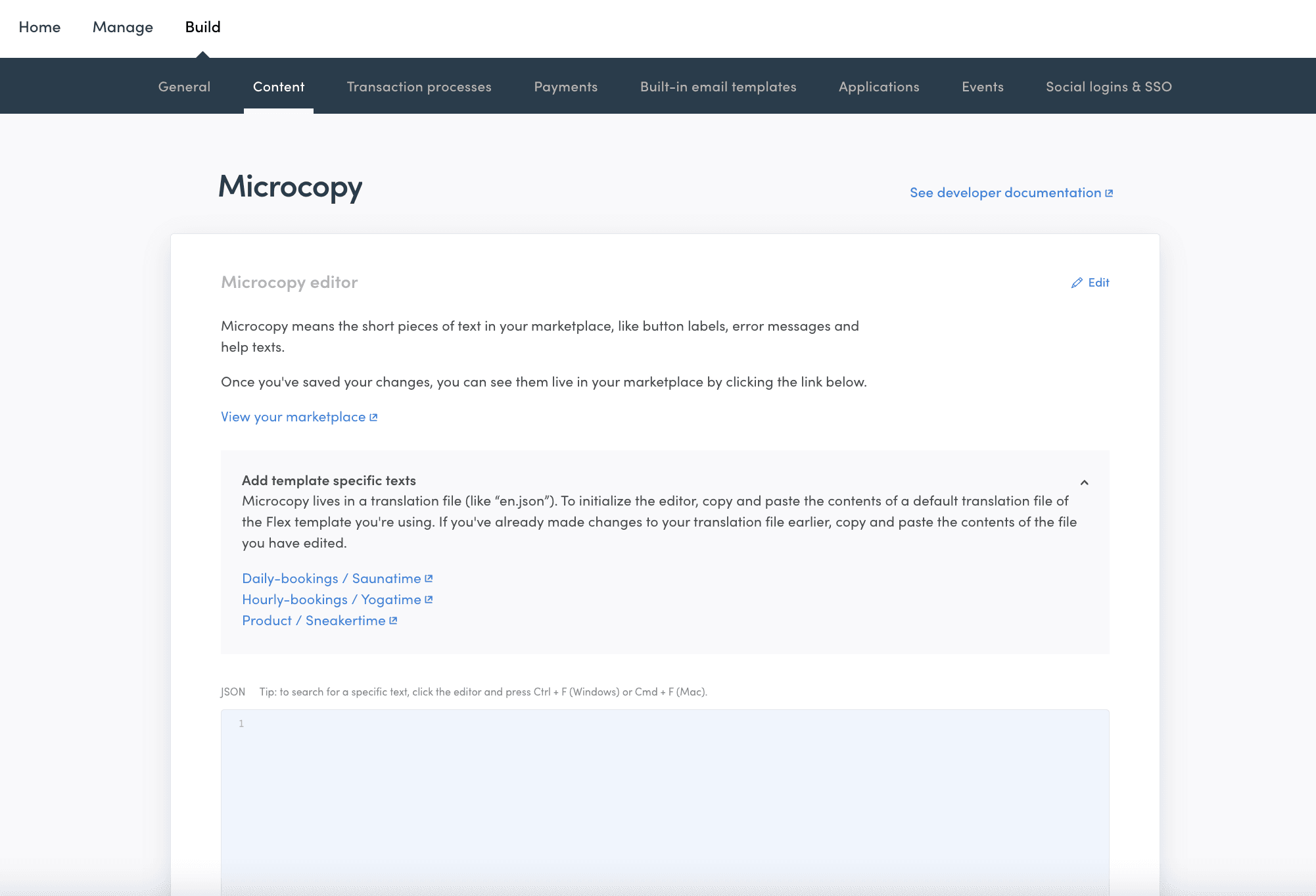 Microcopy refers to all the small pieces of text in your marketplace's dynamic pages – button labels, error messages, and help texts are all examples of microcopy. Modifying microcopy to match your marketplace's theme and tone of voice is a key task in customizing any marketplace. Read more about marketplace microcopy.