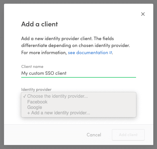 - Go to the Social logins & SSO page in Console and click "+ Add new" to add a new identity provider client.