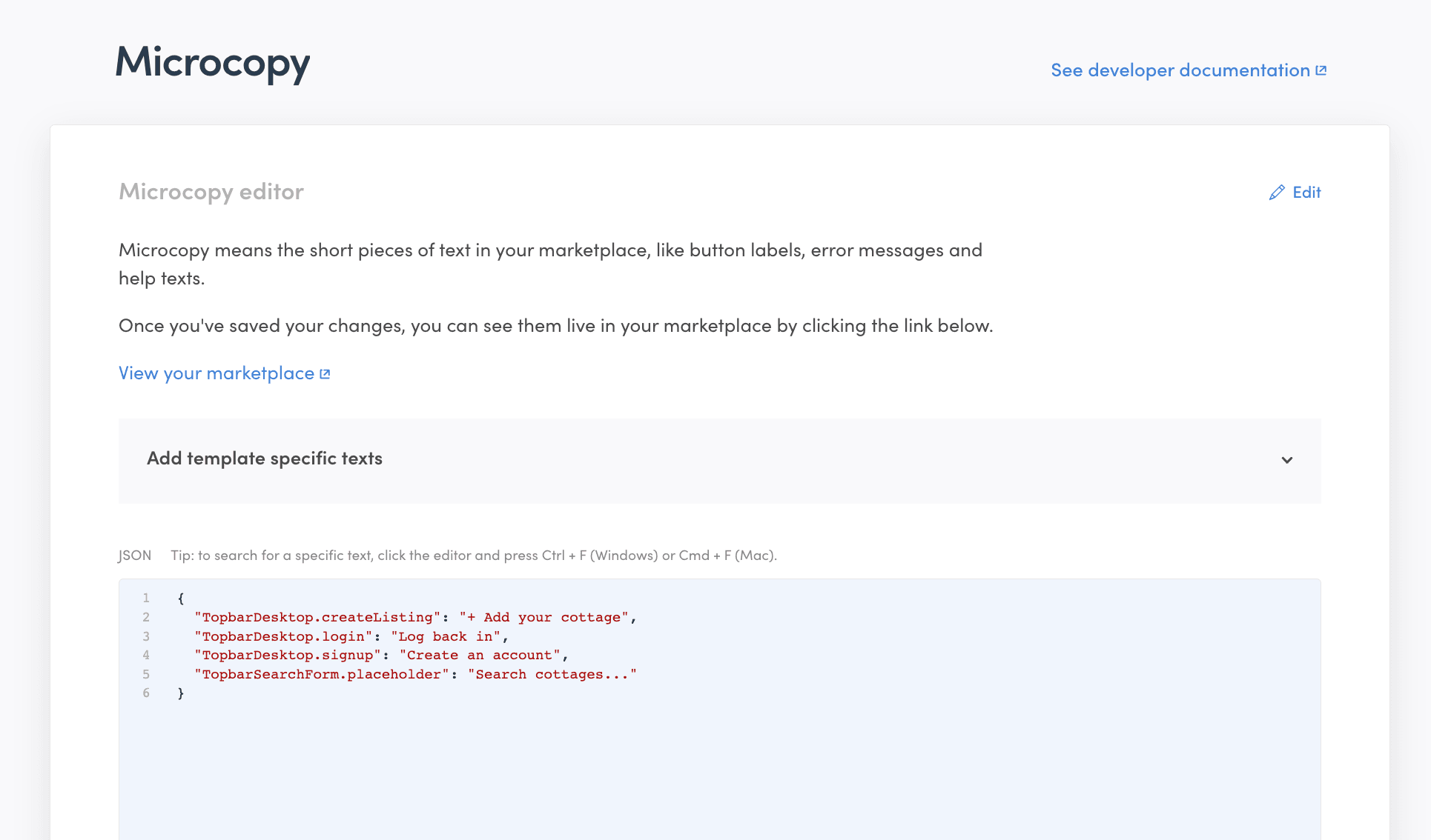 When you first start building your marketplace, the JSON field in the Microcopy section is empty, and all microcopy comes from built-in microcopy files in the template. (We refer to these texts as microcopy, but in the template they are in the translations folder. In addition to the default en.json file, there are other languages available, which is why the folder is titled translations.)